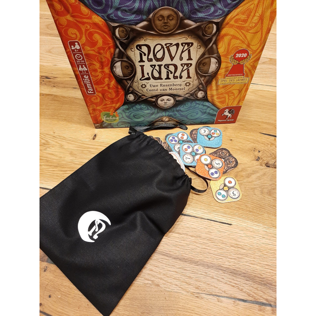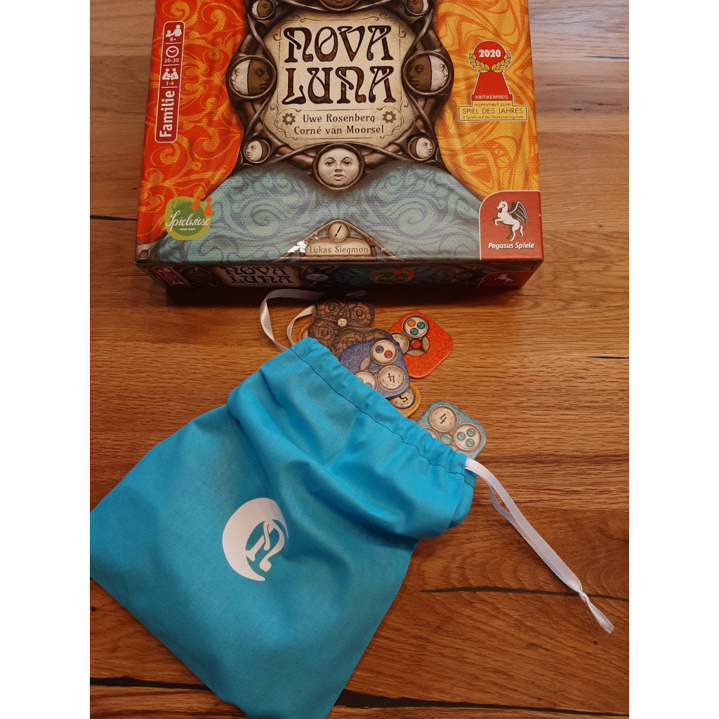 Sac pratique pour le jeu de pose de tuiles Nova Luna, orné du logo assorti. Fini les mélanges et les empilements de tuiles en cachette ! Installation rapide, présentation élégante sur la table et rangement pratique, tout en un. Disponible en plusieurs couleurs.
