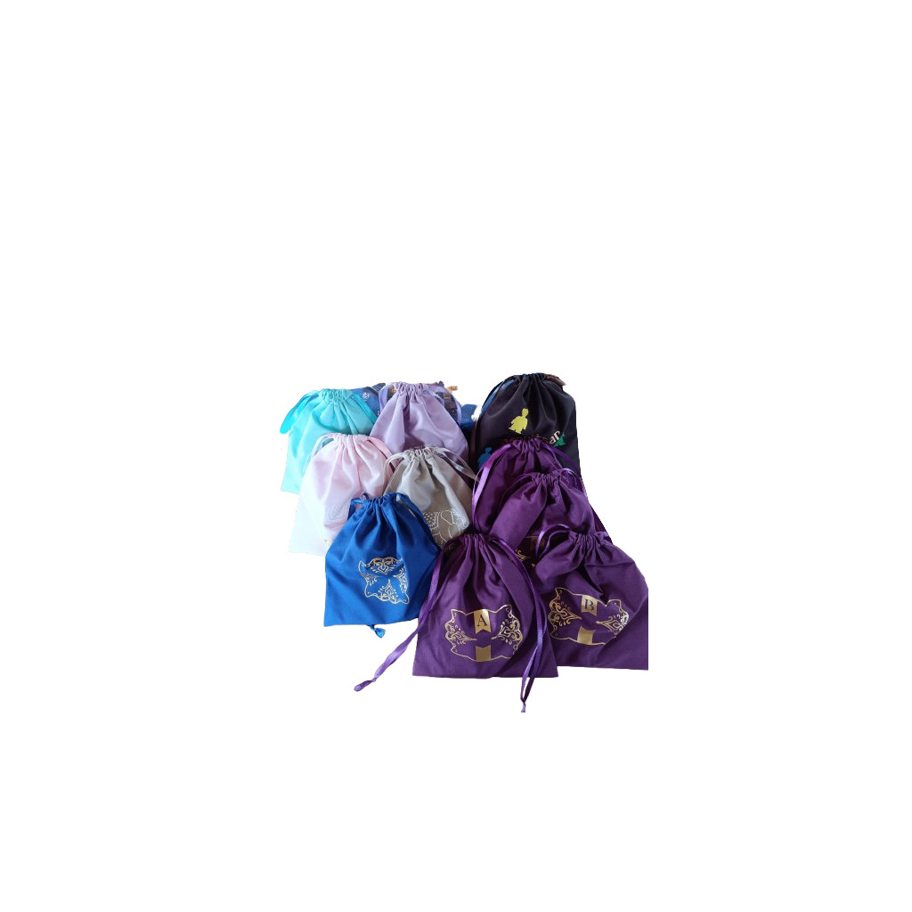 Ensemble de 4 sacs de joueurs aux couleurs assorties, avec inscription dorée et un adorable éléphant blanc, pour ranger les composants.