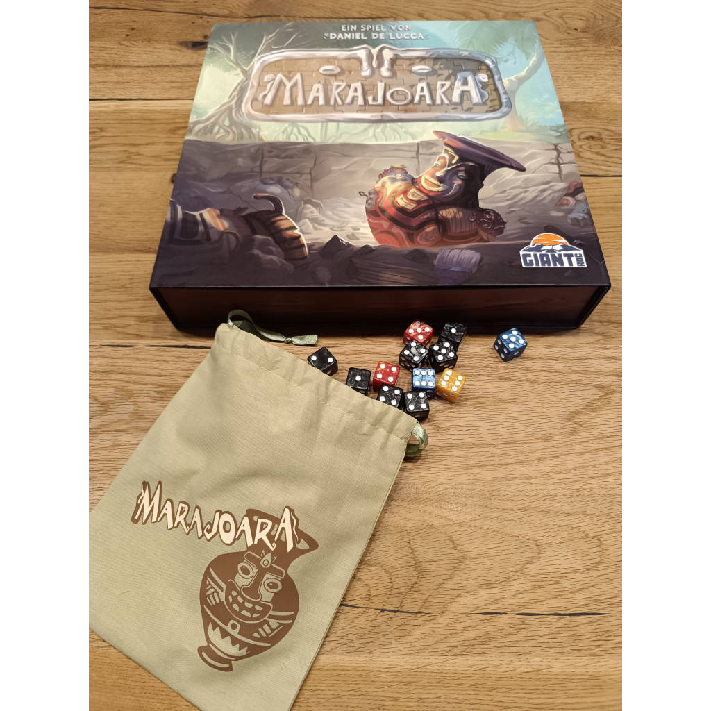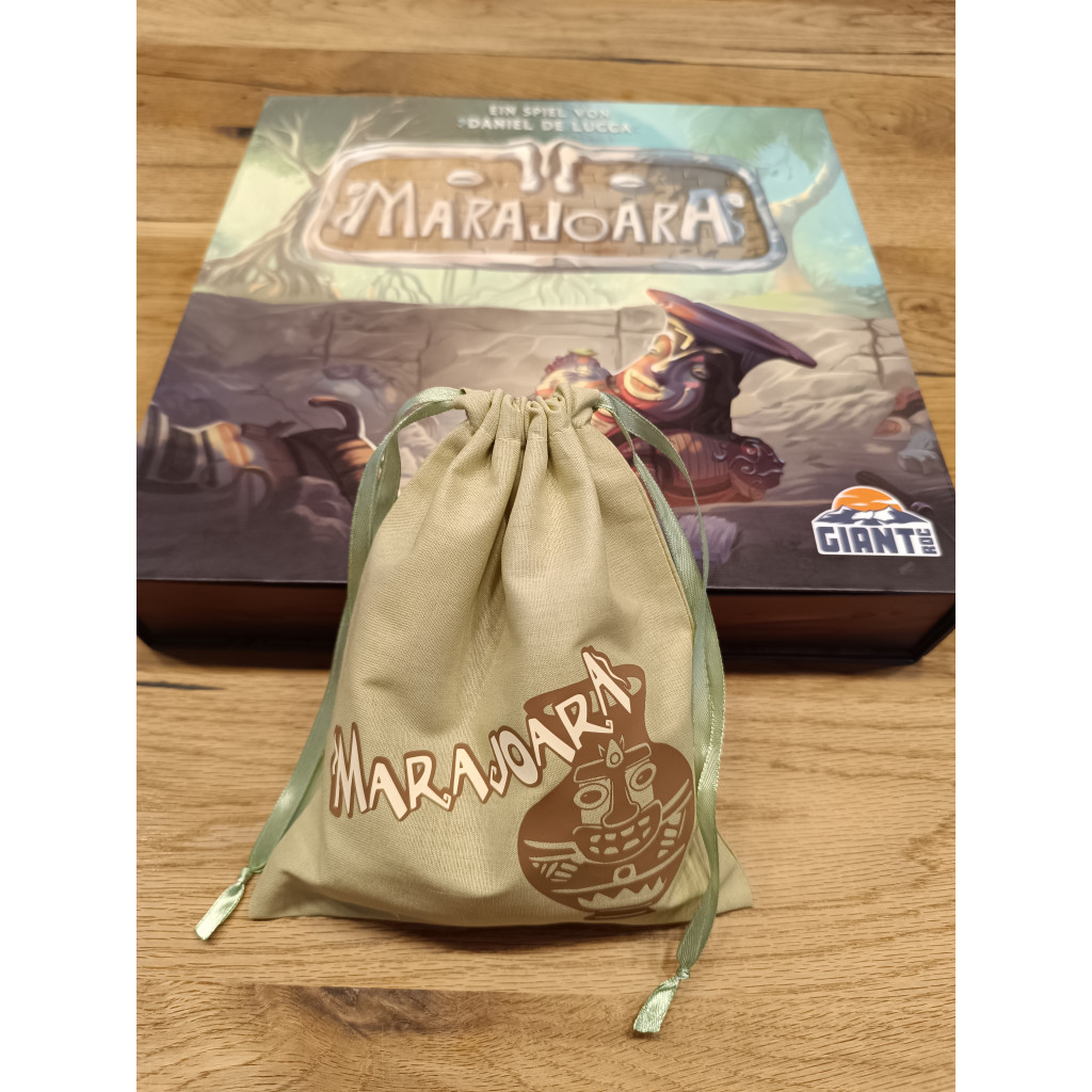 Un joli sac pour le jeu Marajoara, orné du logo assorti. Désormais, les dés peuvent être disposés facilement et aléatoirement sur les emplacements prévus pour la mise en place du jeu. Un bel accessoire pour votre table et une solution de rangement élégante.