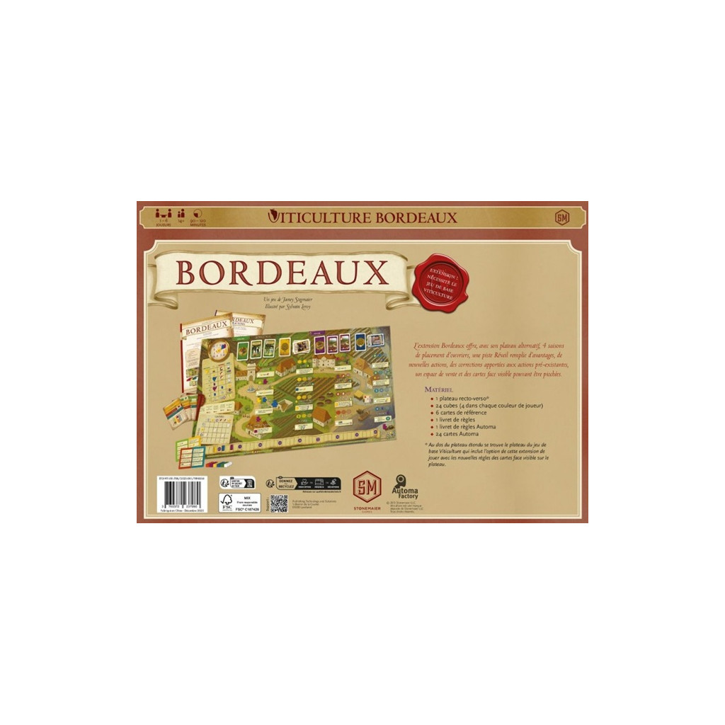 Le plateau Bordeaux est compatible avec toutes les extensions de Viticulture à l'exception de World qui possède son propre plateau.