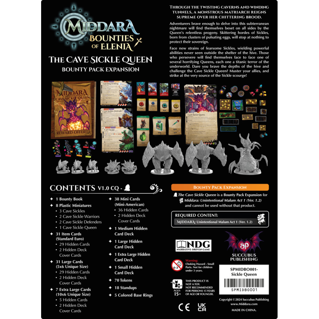 Ce Bounty Pack introduit de nouvelles variantes passionnantes de Cave Sickles qui mettront les joueurs au défi d'adapter leurs stratégies et de développer de nouvelles tactiques. Le Bounty Pack Cave Sickle Queen inclut de nouvelles figurines, jetons et du butin qui donnent vie à la terrifiante écologie de ce monstre emblématique de Middara.