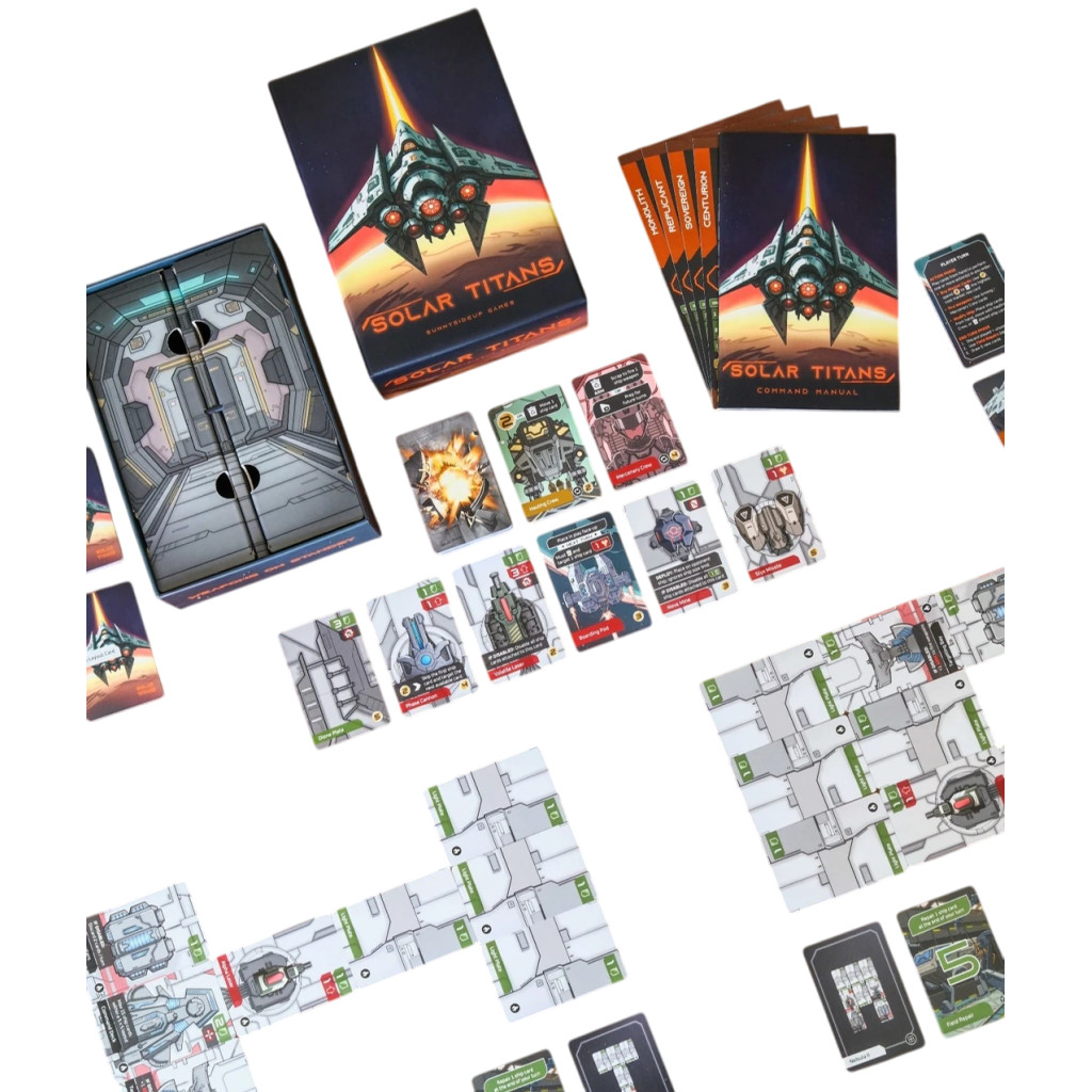 Solar Titans - Definitive Edition combine des mécanismes de construction de deck et de tableau, vous permettant de concevoir votre vaisseau amiral carte par carte. La disposition de votre vaisseau détermine ses capacités de combat et ses vulnérabilités.