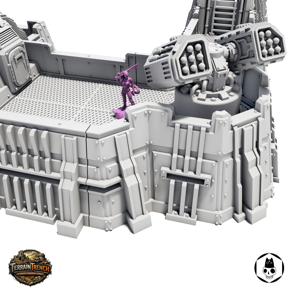 Comprend une grand élément de décor de wargame représentant un mur de défense fortifié. Le mur est équipé de 3 armes différentes pouvant pivoter à 360° et d'une porte fonctionnelle qui peut s'ouvrir pour permettre aux véhicules et aux unités d'entrer/sortir.