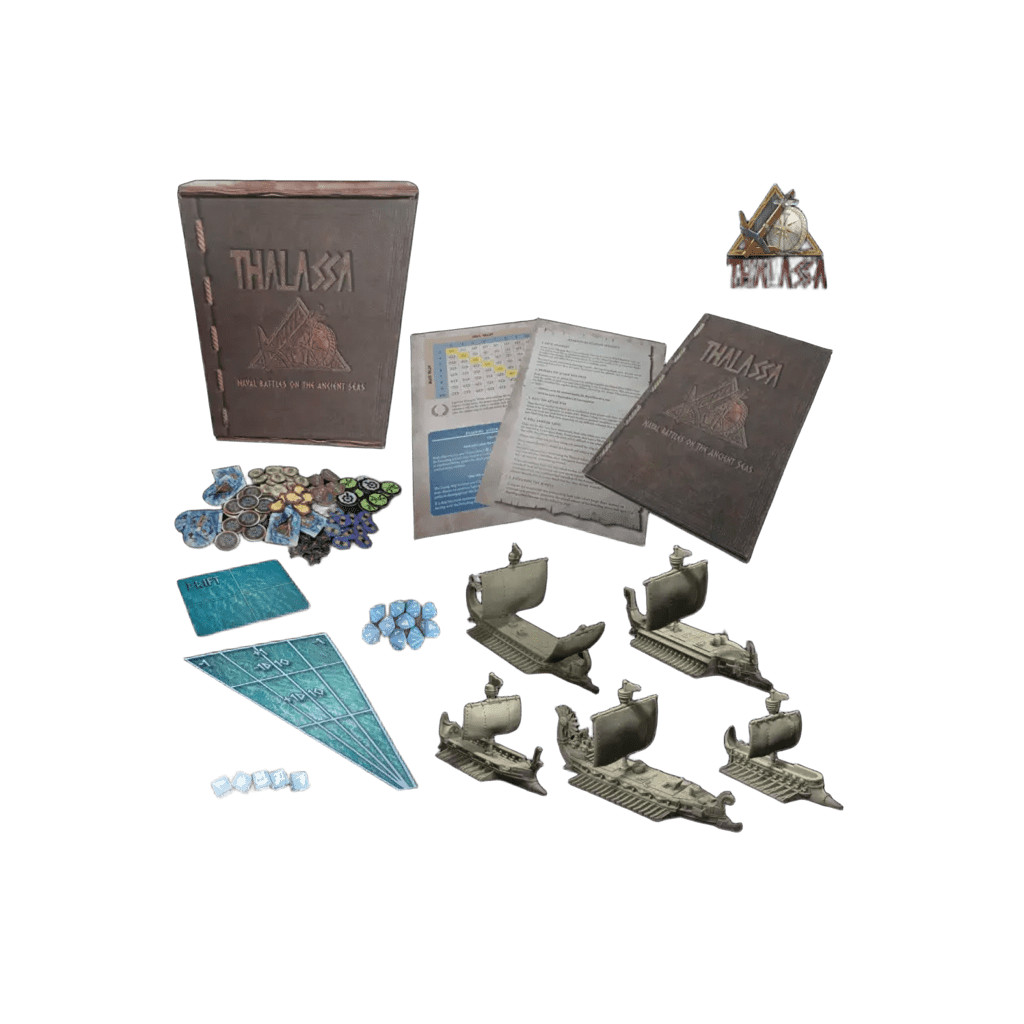 - Un ensemble de dés : 5 dés de commande de flotte et 10 dés à dix faces, ornés du logo Thalassa et disponibles en 4 couleurs différentes (bleu, rouge, vert ou jaune).