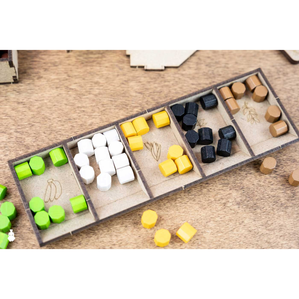 1 boîte de plantations et carrières, avec des emplacements et des gravures pour une configuration différente en fonction du nombre de joueurs