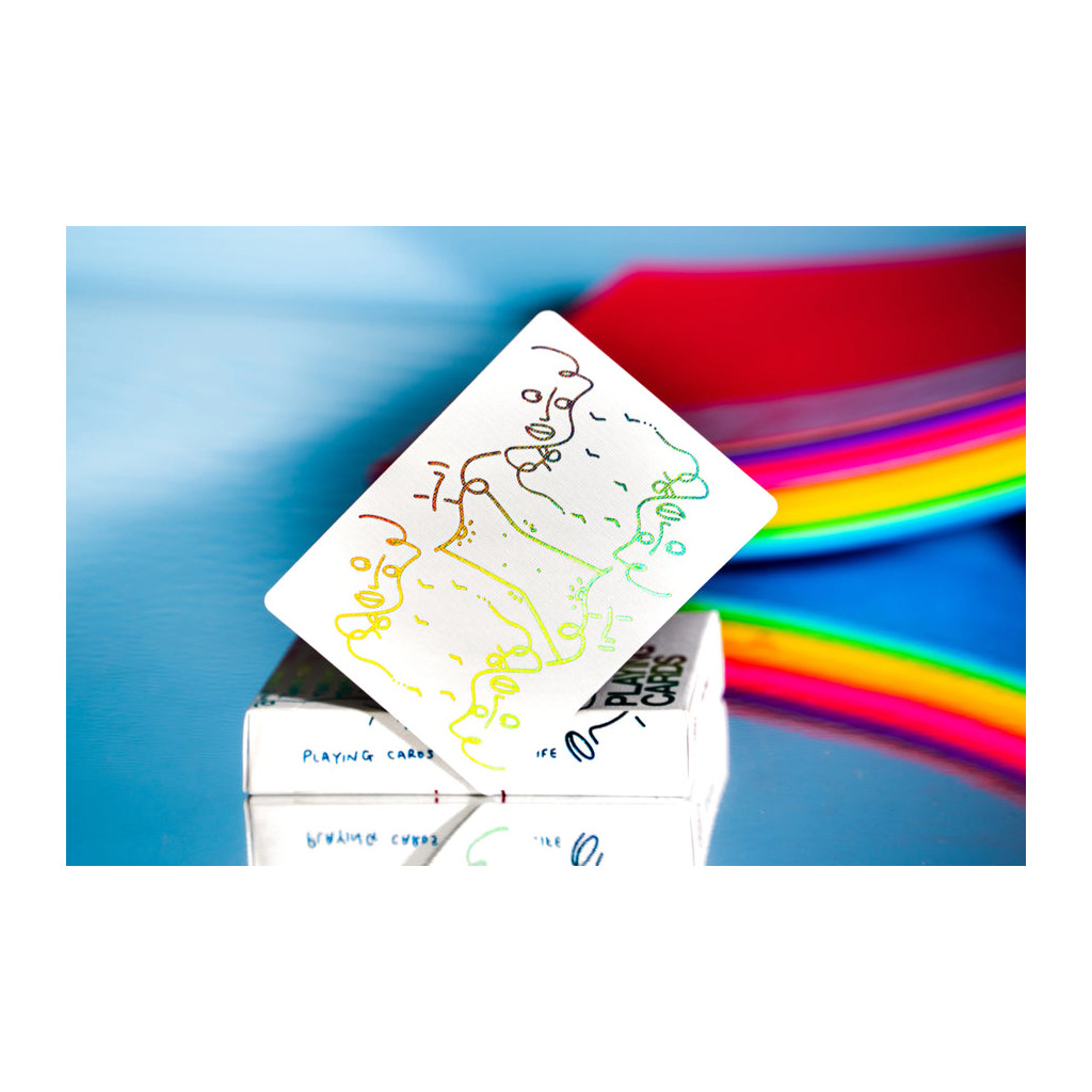 Theory11 est fier d’annoncer cette nouvelle édition limitée de la série Shantell Martin, visant à mettre en lumière son travail d’art et d’illustration véritablement révolutionnaire. Ces cartes à jouer en édition limitée présentent une feuille holographique arc-en-ciel sur l’emballage extérieur et une feuille holographique argentée au verso de chaque carte. L’emballage est imprimé sur du papier certifié FSC, fabriqué à partir d’une énergie verte 100 % renouvelable.