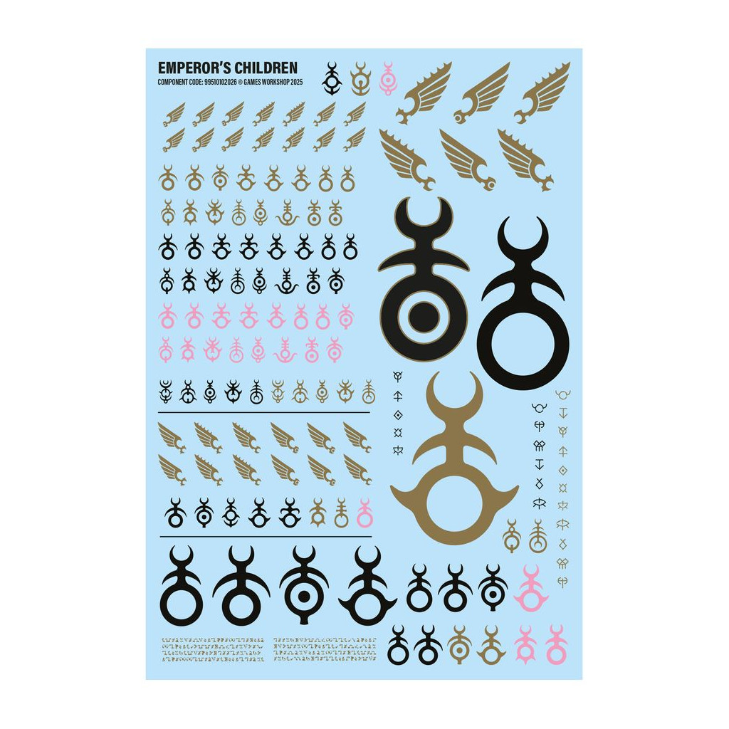 Le kit contient une Planche de Décalcos des Emperor's Children proposant 150 décalcos de grande qualité pour décorer vos figurines. Cela inclut des symboles des Emperor's Children de différentes tailles et couleurs, ainsi qu'une sélection de runes et inscriptions difformes de Slaanesh.