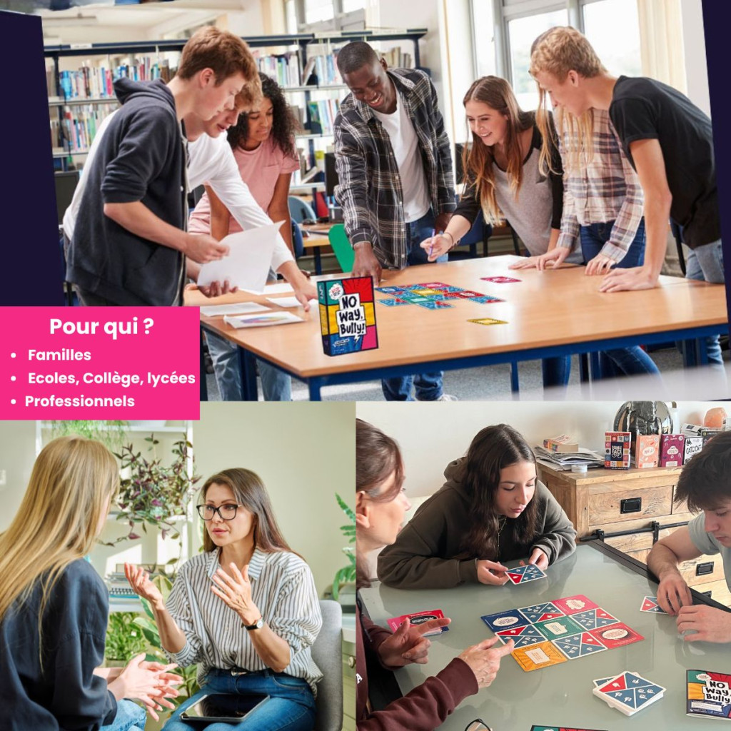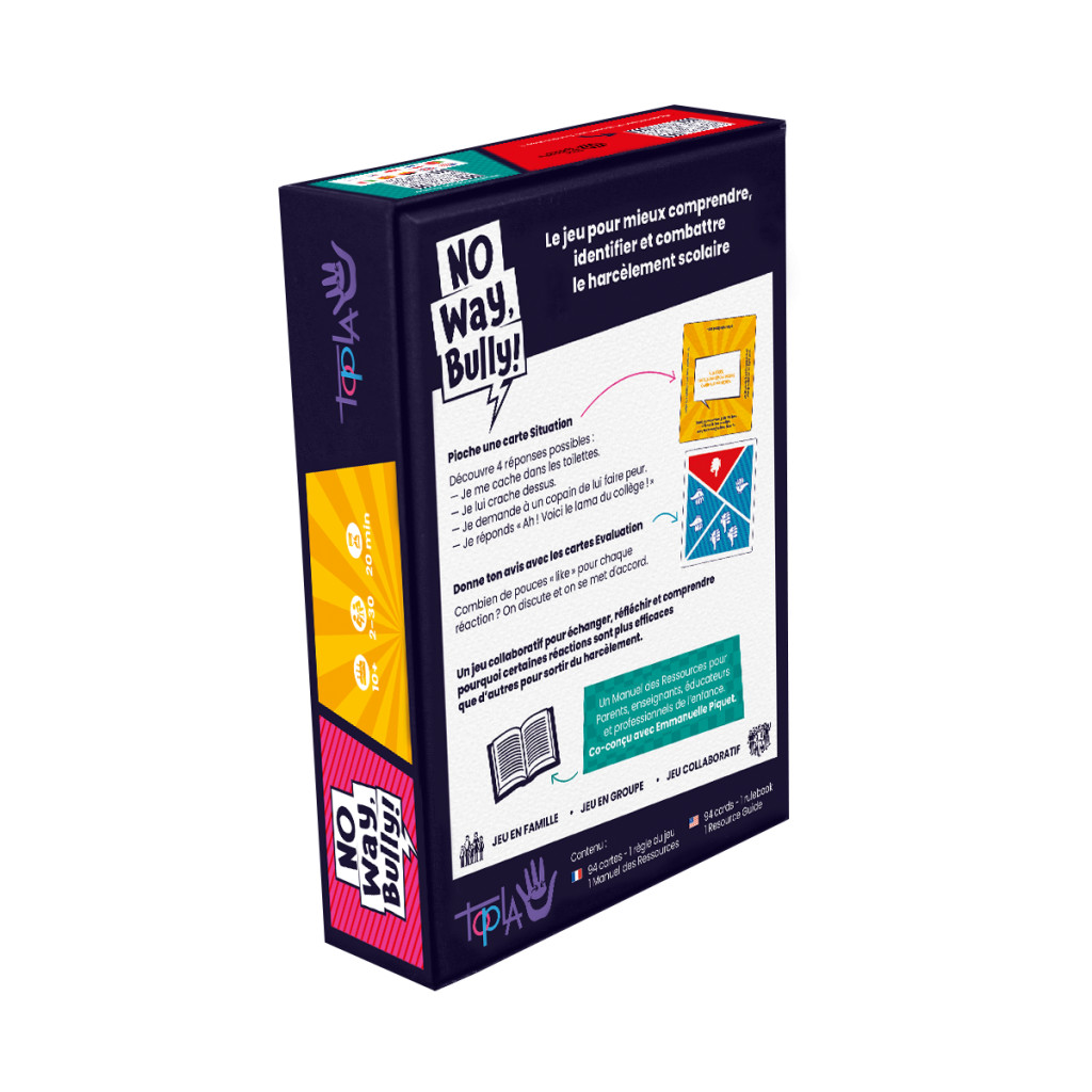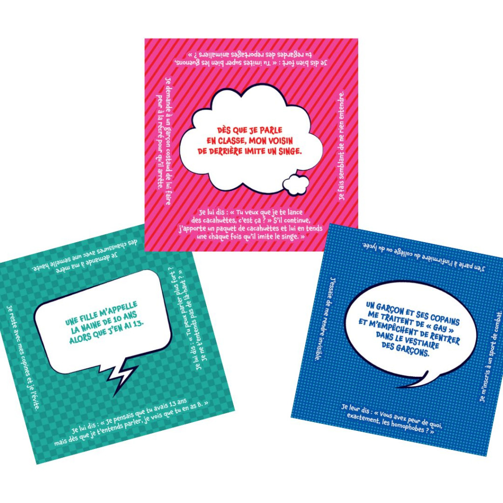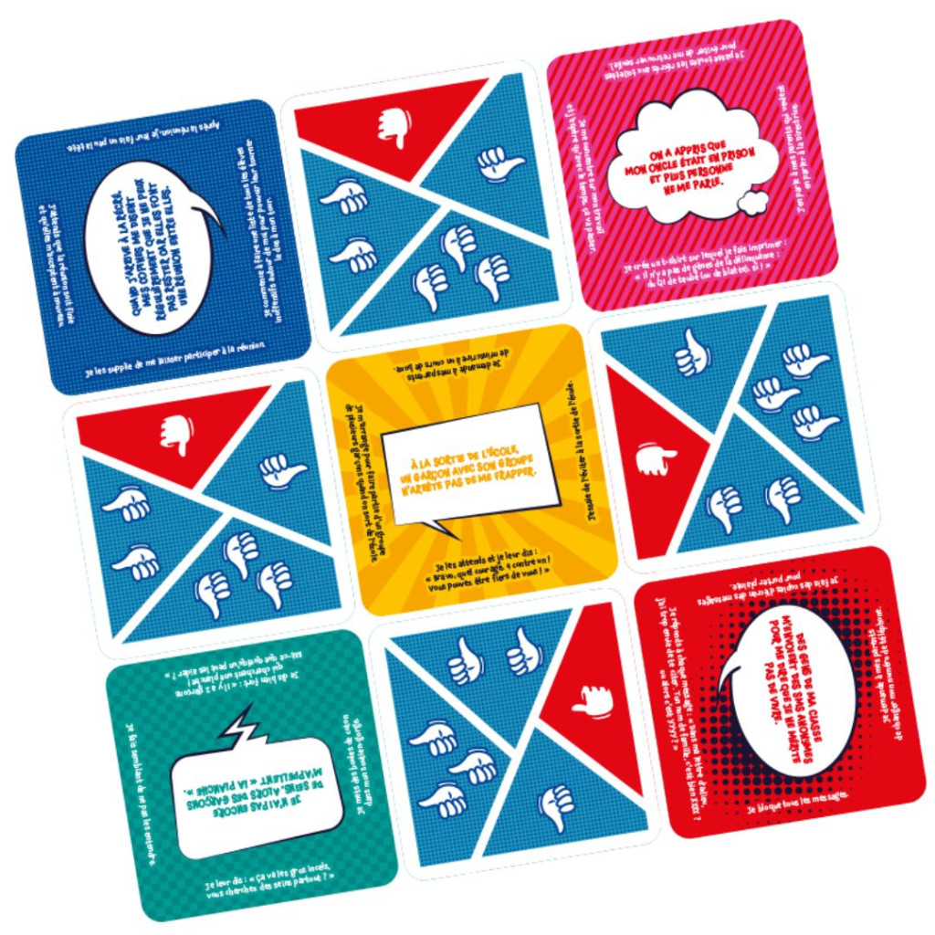 Dans ce jeu, les joueurs et joueuses sont invités à réfléchir ensemble, à discuter et à évaluer plusieurs réactions possibles face à des situations de harcèlement (physique, social, psychologique, cyberharcèlement...)