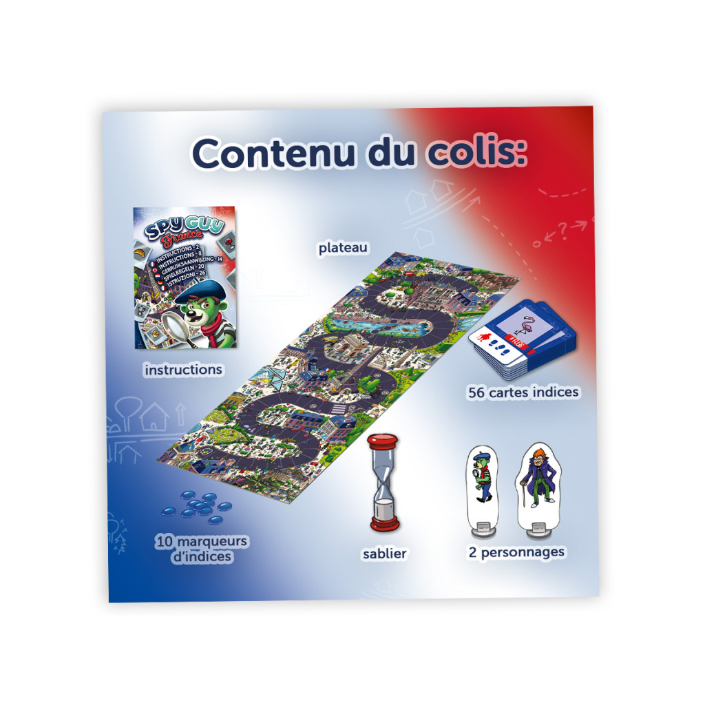 Le jeu se déroule sur un grand plateau coloré, représentant la France et ses monuments emblématiques. À chaque tour, une carte révèle un objet à retrouver. Tous les joueurs scrutent alors le plateau pour le repérer le plus vite possible. Plus vous trouvez d’objets, plus Spy Guy avance dans sa poursuite, tandis que le voleur gagne aussi du terrain. Avec ses règles simples et ses parties rapides d’environ 20 minutes, Spy Guy - France est idéal pour jouer en famille avec des enfants dès 5 ans.