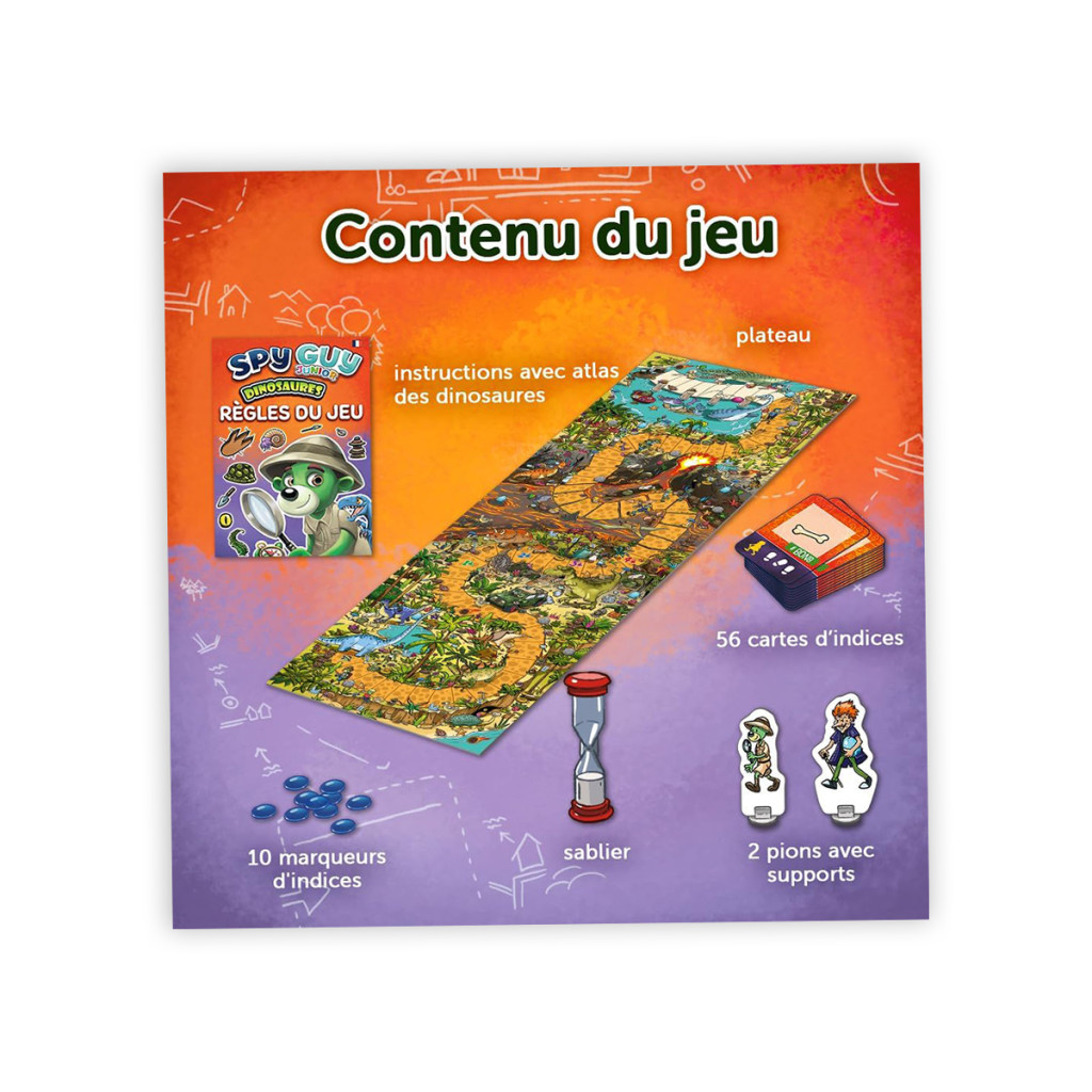 Le jeu propose une mécanique accessible : à chaque tour, les joueurs cherchent sur le plateau les éléments représentés sur les cartes. Plus vite ils les repèrent, plus Spy Guy avance dans sa poursuite. Grâce à des règles simples et des parties courtes, Spy Guy Junior - Dinosaurs est parfaitement adapté aux enfants dès 3 ans. C’est un jeu d’observation dynamique qui stimule la concentration et développe la coopération, tout en permettant aux plus jeunes de s’amuser avec une vraie aventure d’enquête.