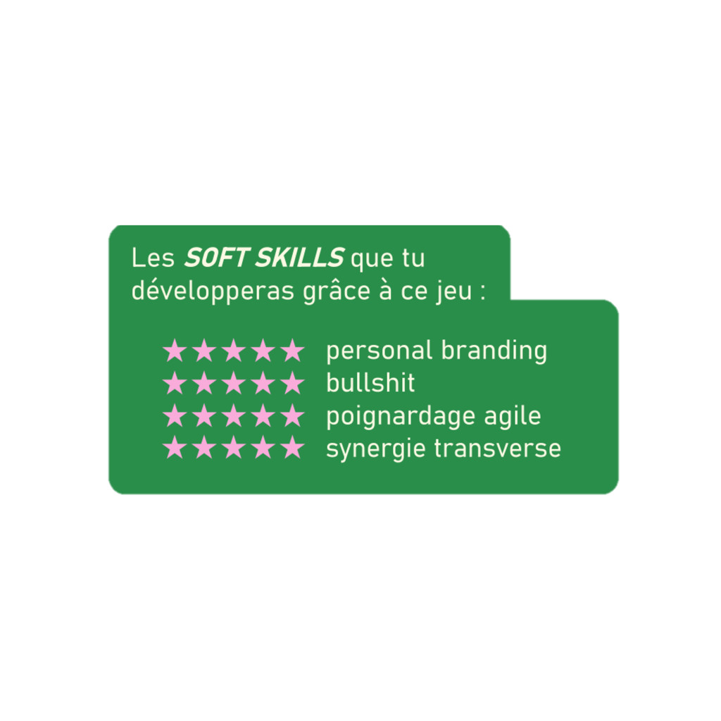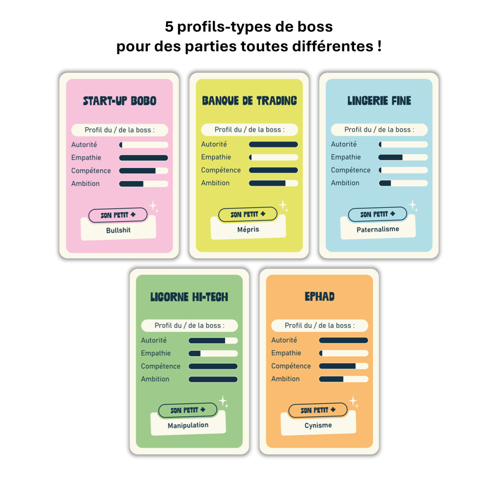 - 5 profils de boss à affronter : start-up bobo, banque de trading, lingerie fine, licorne Hi-Tech, EHPAD