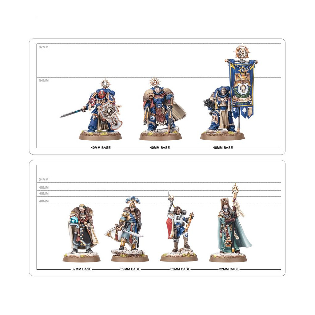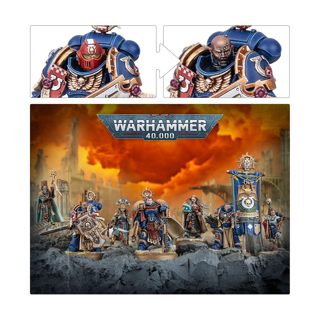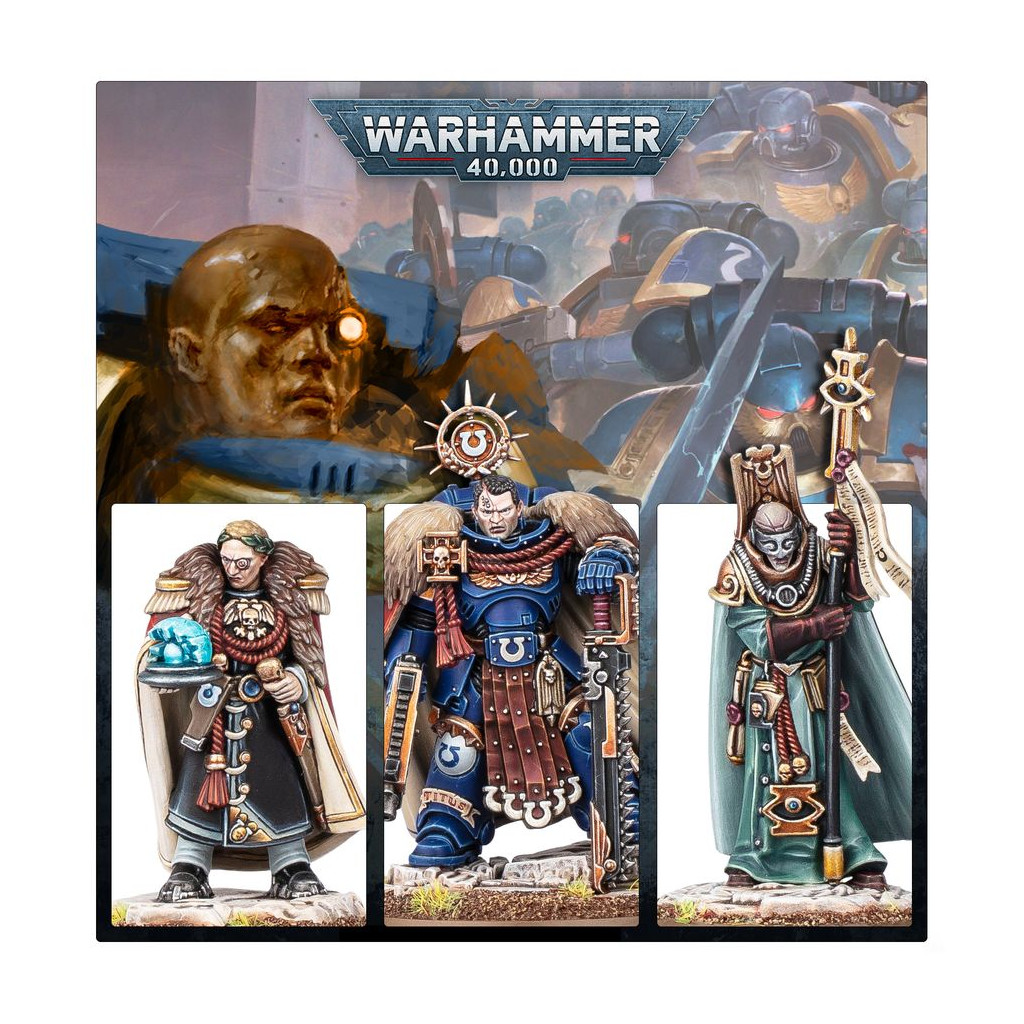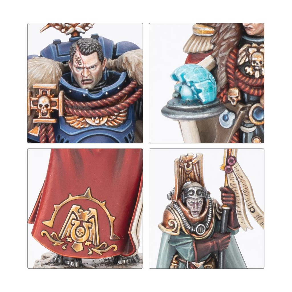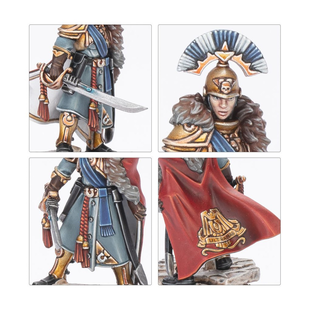 En plus de ces guerriers éprouvés, vous trouverez une poignée d'autres individus essentiels aux projets de Titus pour les Cinq Cents Mondes. Gaius Silva commande le vaisseau amiral de sa flotte, et Dainal Kornélius en est l'Astropathe en chef. Æmélia Minervas est une Legatus respectée des Auxiliaires de Défense d'Ultramar, et Lucia Vestha une négociatrice hors pair. La bataille n'est étrangère à aucun d'eux. Si vous souhaitez pour vos Ultramarines un commandant n'ayant peur de rien, n'allez pas chercher plus loin, et ce kit vous propose également un projet de peinture exaltant sur une poignée de personnages fascinants.