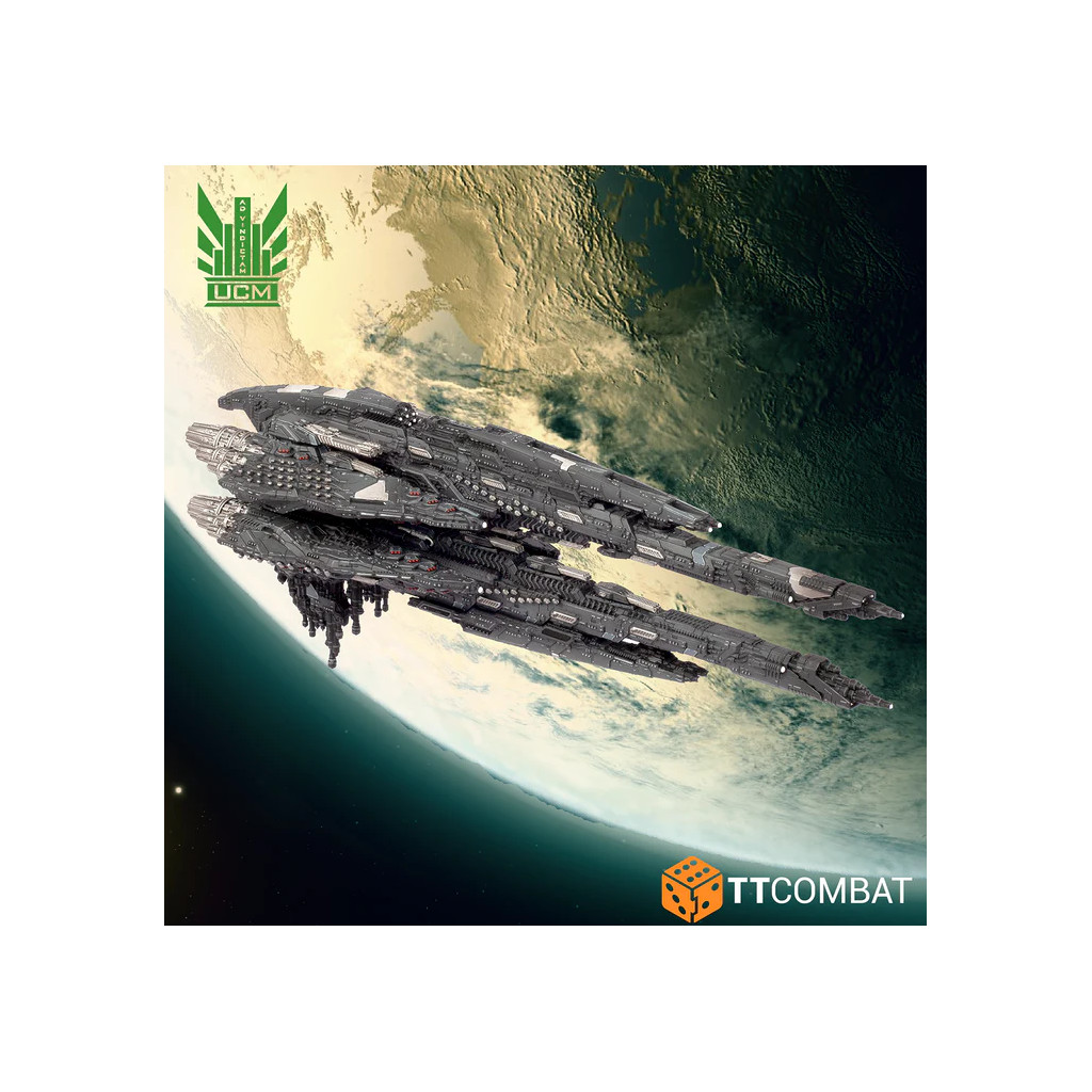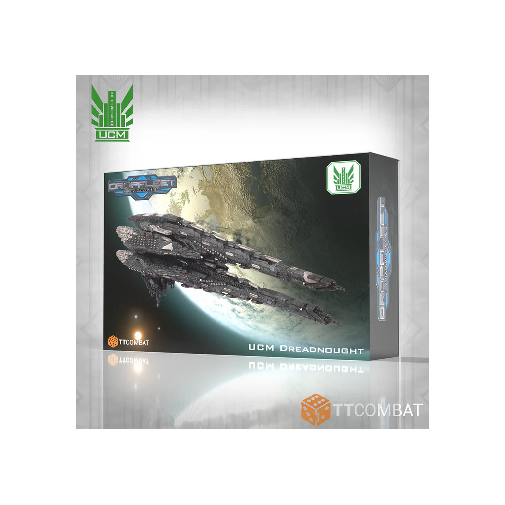 Voici les plus grands vaisseaux jamais vus dans Dropfleet Commander. L'un des kits de vaisseaux spatiaux les plus détaillés de tous les temps, l'UCM Dreadnought mesure 195 mm de long et possède une coque à double corps, caractéristique de l'ingénierie UCM.
