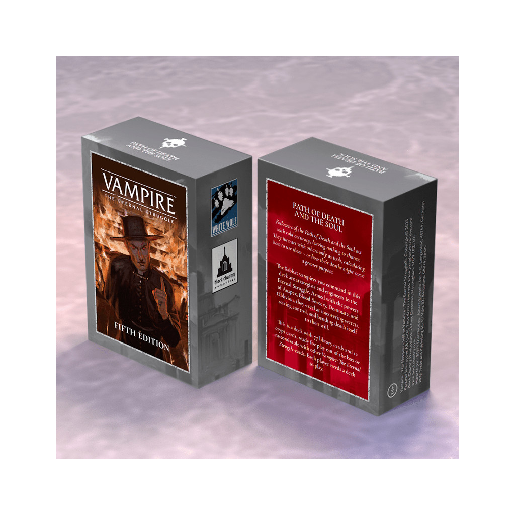 Les vampires du Sabbat que vous commandez dans ce deck sont des stratèges et des ingénieurs de la Lutte Éternelle. Armés des pouvoirs d’Auspex, de Sorcellerie du Sang, de Domination et d’Oblivion, ils excellent à découvrir les secrets, à prendre le contrôle et à soumettre la mort elle-même à leur volonté.