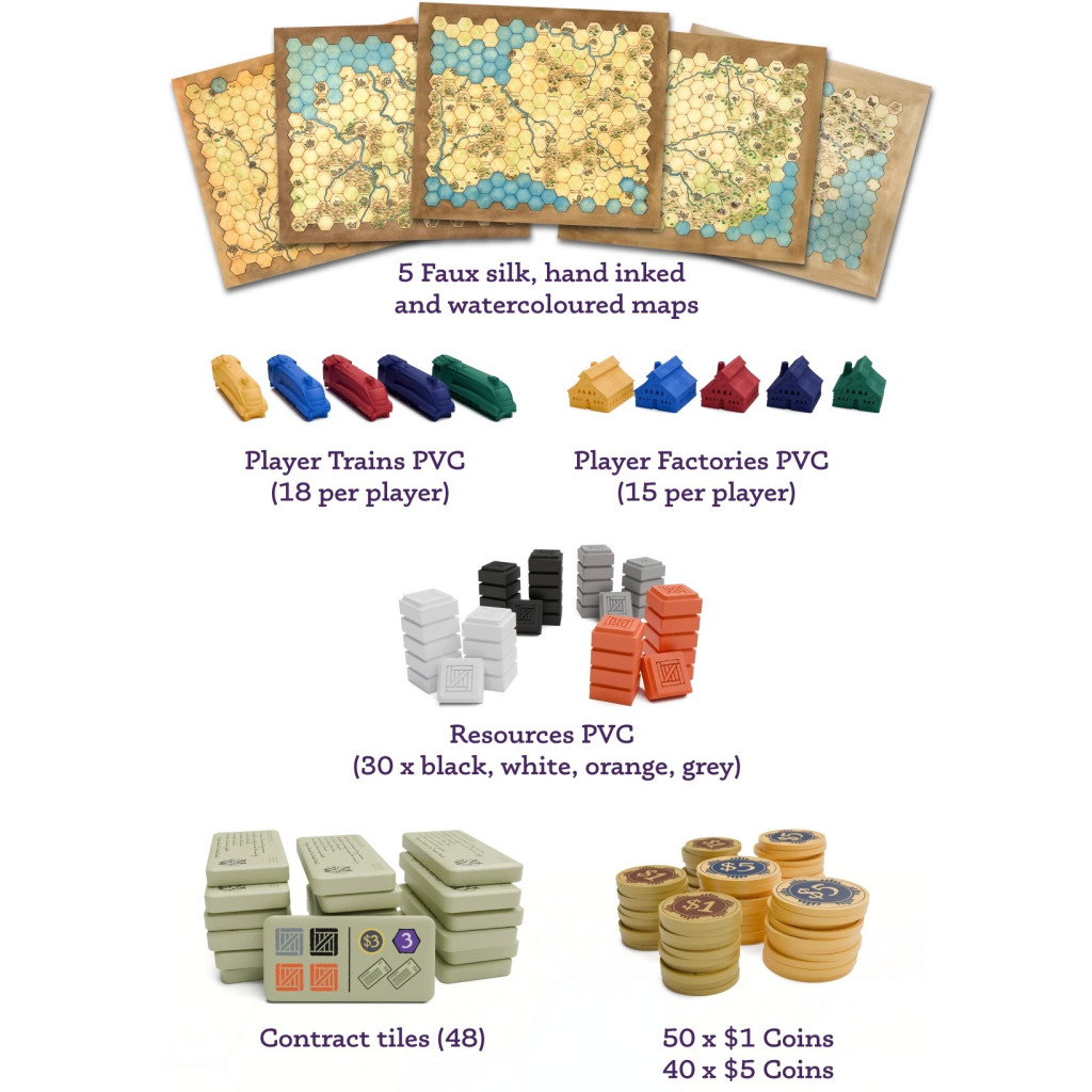 Steam Power: Deluxe Edition diffère du jeu de base Steam Power car une extension de quatre cartes est incluse dans la boîte et les composants ont été améliorés.
