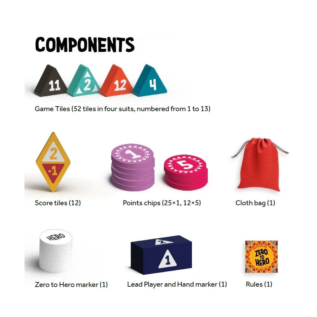 Pour ajouter un peu de piment au jeu, vous pouvez remporter une levée avec un « 2 » si vous êtes le seul joueur à jouer une tuile de cette couleur. Enfin, si le jeu se passe vraiment mal pour vous et que vous terminez une main avec exactement zéro point, vous pouvez remporter la partie si, lors de la main suivante, vous gagnez cinq points ou plus : de zéro à héros !