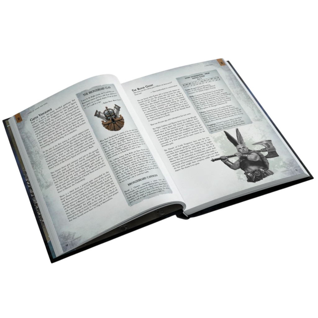 - Des idées pour thématiser des aventures liées aux Nains : relations avec les nations voisines et les bastions rivaux — qu’ils soient amicaux ou hostiles — ainsi qu’un aperçu de la façon dont la dévotion naine à l’honneur, aux serments et à la vengeance peut mener à de nouvelles quêtes et à de dangereuses complications.