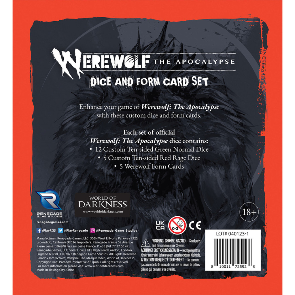 Améliorez votre partie de Werewolf: The Apocalypse avec ces dés et cartes spécialement conçus pour clarté et style. Chaque set officiel pour un joueur comprend des dés et cinq cartes de forme pour suivre laquelle des cinq formes votre personnage utilise et rappeler les règles de cette forme.