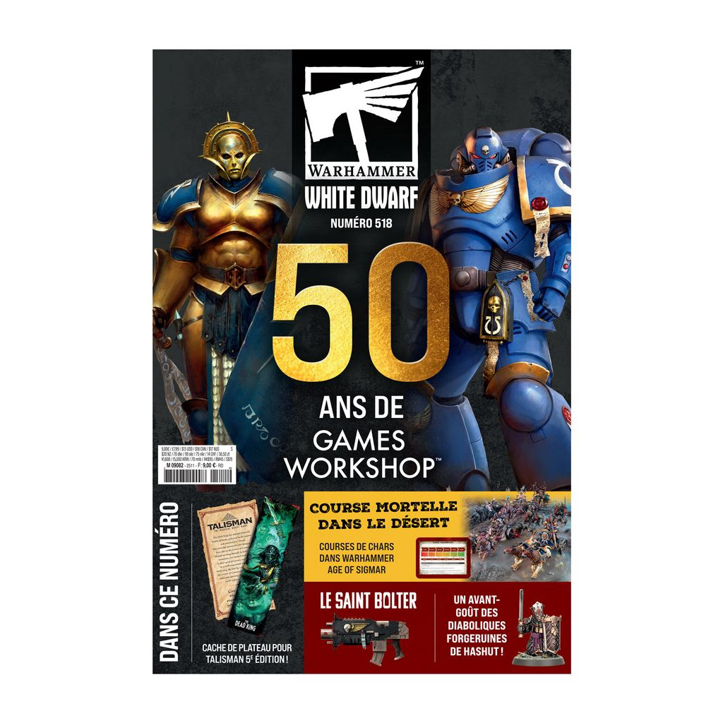 Chaque exemplaire de White Dwarf 518 s'accompagne d'un encart en carton comprenant un cache de plateau prédécoupé et une carte d'histoire pour le jeu de plateau Talisman 5e Édition, qui voit les joueurs affronter The Dead King. Vous y trouverez aussi une carte Tacticus pour l'appli de jeu Tacticus, qui déverrouille Nicodemus – Prêtre Sanguinien, et un carton double face comprenant les scénarios du mois pour Warhammer 40,000 et Warhammer Age of Sigmar.