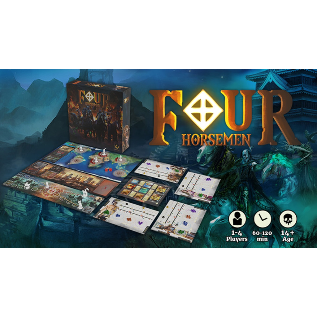 Avec de superbes illustrations sur chaque carte, des figurines de héros et de cavaliers et un mélange surprenant de mécanismes de jeu, Four Horsemen est un jeu où chaque tour apporte de nouveaux défis. Avec une grande variété de héros, de méchants et d'événements, Four Horsemen propose des milliers de scénarios uniques, ce qui signifie qu'il n'y a pas deux apocalypses identiques.