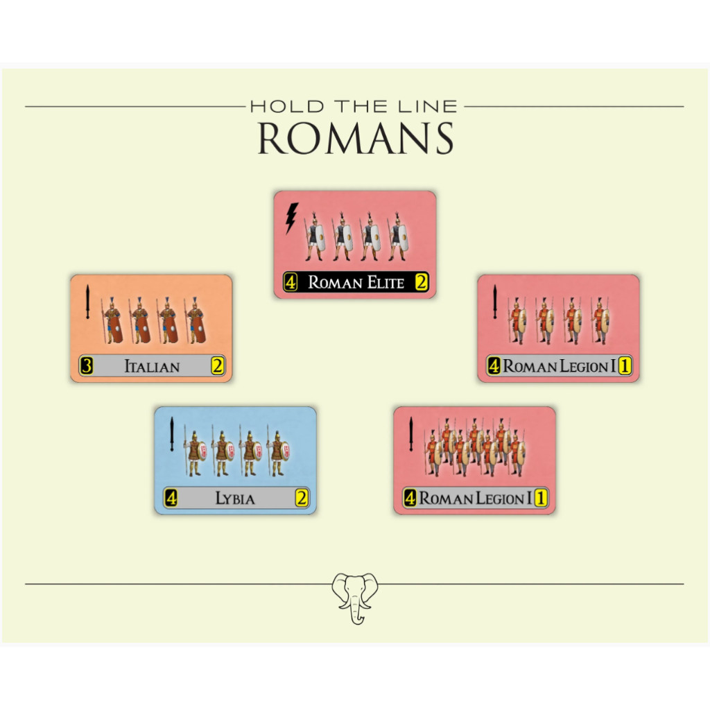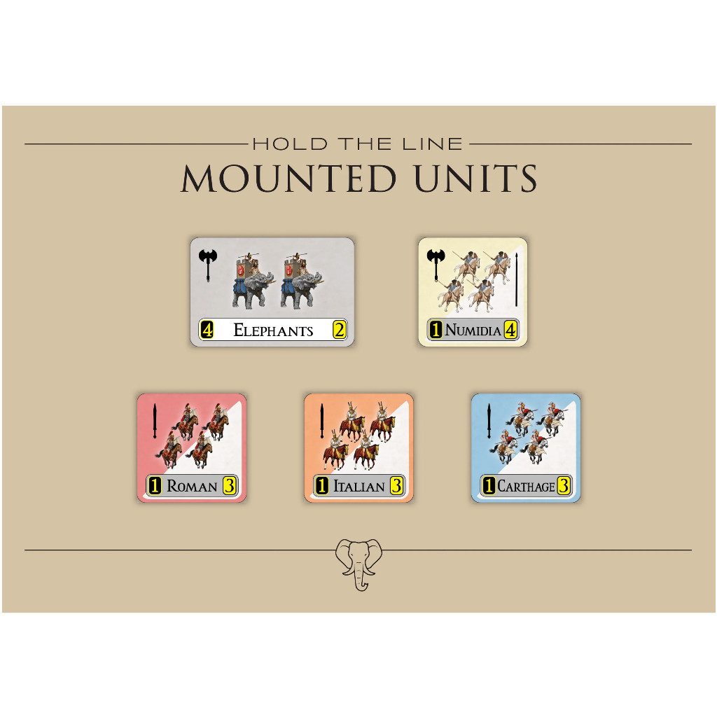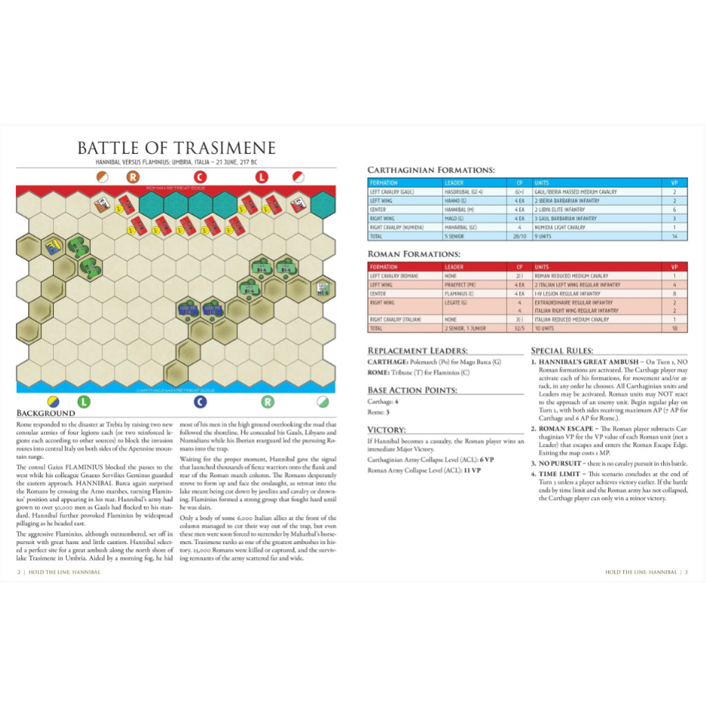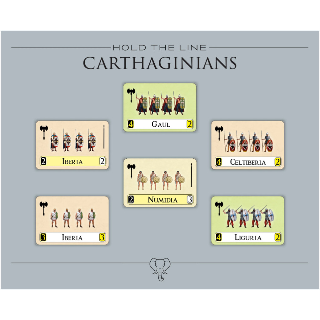 Hold the Line: Hannibal est un jeu tactique grand format pour deux joueurs, mettant en scène 10 des plus grandes batailles des guerres puniques. S'inspirant du système Commands and Colors de Richard Borg et, plus directement, de la série Hold the Line de Worthington, Hannibal utilise le même plateau de jeu standard, composé de 13 hexagones de large et 9 hexagones de profondeur.