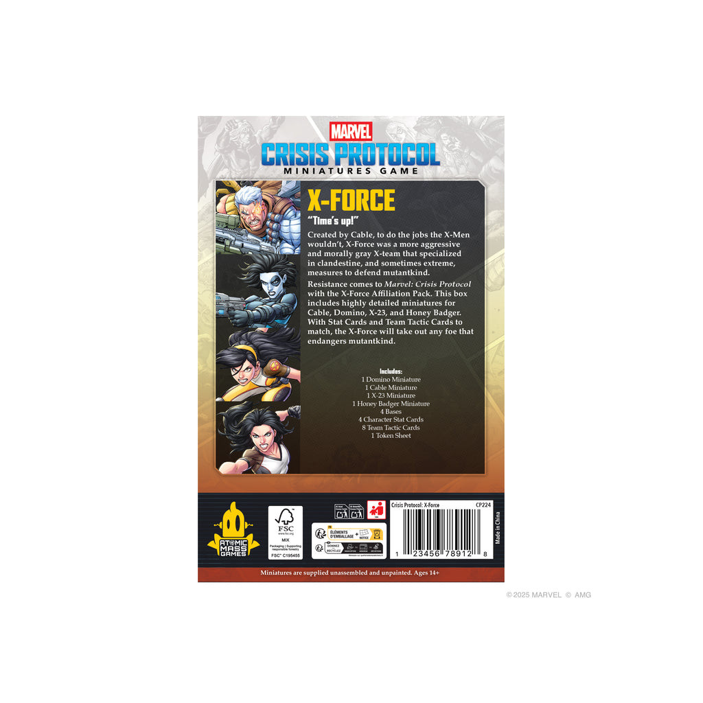 La Résistance intègre Marvel : Crisis Protocol avec le Set d’Affiliation X-Force, une unité prête à éliminer tout ennemi qui mettra en danger les mutants. Créée par Cable, pour réaliser les tâches que les X-Men ne veulent pas faire, la X-Force est un groupe d'intervention agressif et sans morale, spécialisé dans les actions clandestines et parfois extrêmes, afin de défendre les personnes mutantes.